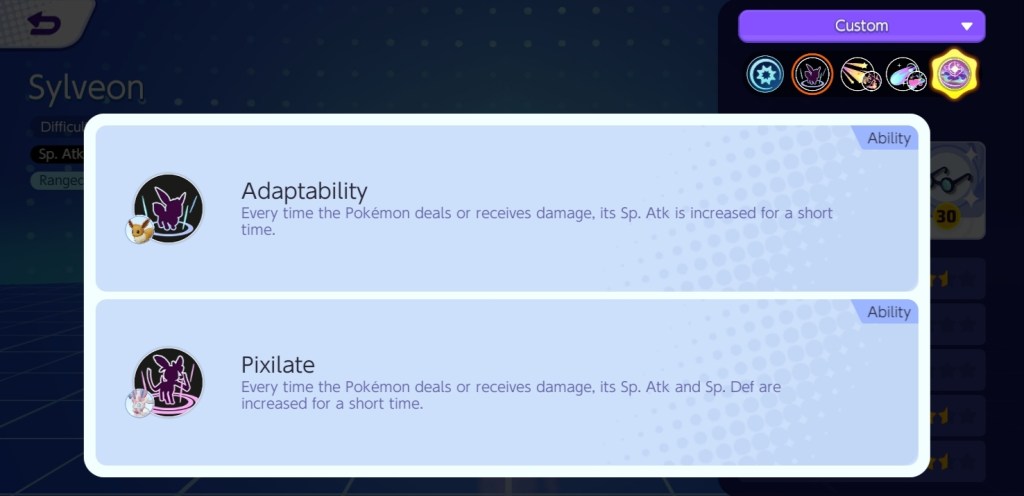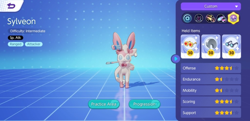 Sylveon is a ranged attacker that uses the Sp.Atk (Special Attack) stat. You might be wondering what Sp.Atk means. Every move made by a Pokémon in the game is categorized as an “attack” or a “Special Attack.” An Attack can inflict damage based on a Pokémon’s attack stat just by attacking, which can be enhanced with the utilization of abilities and other items, resulting in Boosted Attack. Basic attacks are counted as Physical Attacks for all Pokémon (using the Attack stat), even if the Pokémon performing them is a Special Attacker. Special Attack, on the other hand, is a type of attack in which the utilization of skills happens to deal skill damage based on a Pokémon’s Special Attack stat. This also means that a Pokémon can deal significant damage alone by using its skills, which can be boosted by holding specific items that increase Sp.Atk. Physical Attackers, in particular, will never use the Special Attack stat, although Special Attackers will continue to use the Attack stat for Basic Attacks.