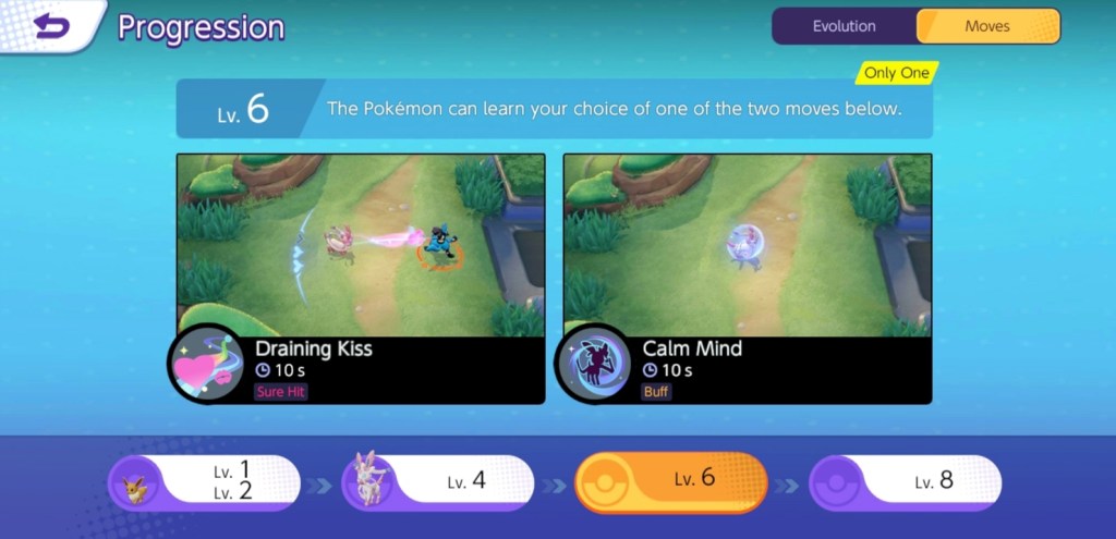 As the game progresses and Sylveon reaches Level 6, the player must once again select between Draining Kiss and Calm Mind as the successor skill for Baby Doll Eyes. When I’m solo in a ranked game, which is most of the time, I always play it safe by selecting Draining Kiss since there’s more damage to deal and it can restore HP to your Pokémon when its kisses blow towards and hit your opponents. Upgrading Draining Kiss would result in an increase in the amount of HP this move restores. Calm Mind, however, should be carefully considered depending on the situation and the team you are with, as this talent only gives you a benefit that enhances your Sp.Atk, Sp.Def, and movement speed at the very least.