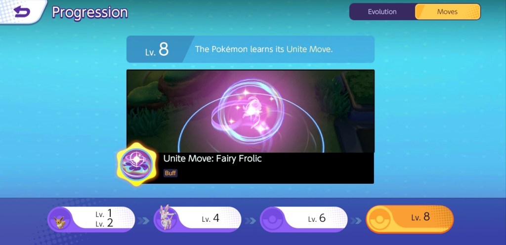 Eventually, Sylveon will learn its last skill – which is its ultimate move – upon reaching Level 8. Sylveon’s ultimate move/unite move: Fairy Frolic sends Sylveon leaping into the air, making it temporarily invincible. Sylveon does damage to opponent Pokémon in the area of effect and restores its own HP as soon as it lands. A percentage of the damage Sylveon deals is transformed into HP for Sylveon’s benefit for a brief time afterward.